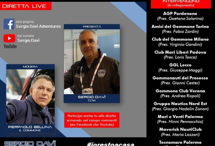 Sabato 11 aprile alle ore 16.00 nuova #direttalive di Sergio Davì e Pierpaolo Bellina della Rivista Il Gommone che in collegamento con i più importanti club gommonautici d’Italia parleranno delle prospettive di ripresa del settore per fronteggiare il … Continua la lettura di Diretta Live